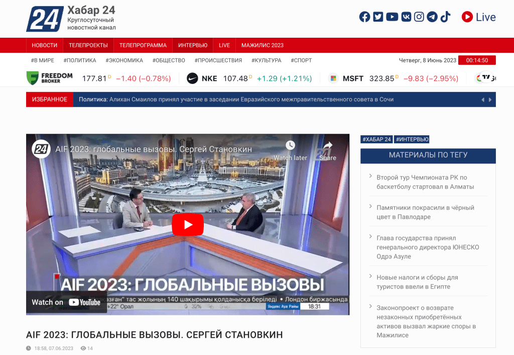 8 июня, в четверг начал свою работу Международный Форум Астана, а в среду на телеканале “Хабар24” вышло моё интервью о предстоящем Форуме. Тема Форума – “Преодоление вызовов через диалог”. Наверняка, многие участники будут говорить о глобальных решениях. Я же в своём интервью национальному телеканалу Казахстана “Хабар24” постарался сконцентрироваться на вызовах, которые предстоит решать Казахстану. Кстати, примерно на эту же тему я планирую выступать на форуме 9 июня на сессии ГЛОБАЛЬНЫЕ ВЫЗОВЫ И ВОЗМОЖНОСТИ ДЛЯ СОВРЕМЕННОГО КАЗАХСТАНСКОГО БИЗНЕСА. Эта сессия начнется в 13.45 в ТУРКЕСТАН Холл , Конгресс-Центр, Первый Этаж.